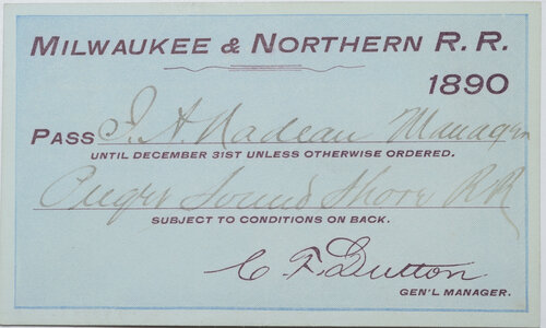 Lot: 482 Description: MILWAUKEE & NORTHERN RR PASS – 1890 annual pass No. 522 issued to J.A. Nadeau, Manager Puget Sound Shore RR. Purple on blue. Glue residue on reverse but all text intact. Minimum bid: $40 Price Realized: $40 |