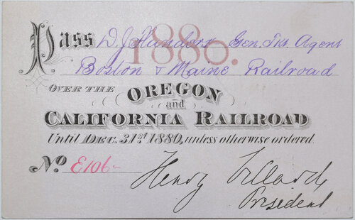 Lot: 483 Description: OREGON & CALIFORNIA RR PASS -1880 annual pass No. E101 issued to D.J. Flanders, Gen. Trav. Agent Boston & Maine Railroad. Black on tan with glue residue on reverse. Early offering and harder to find. Minimum bid: $100 Price Realized: Not sold |