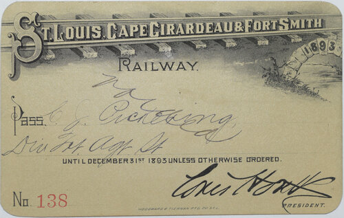 Lot: 486 Description: St LOUIS CAPE GIRARDEAU & FORT SMITH PASS – 1893 annual pass No. 138 issued to E.J. Pickering Div. Frt. Agt. Void has been written across the pass. Nice vignette. Minimum bid: $20 Price Realized: $45 |