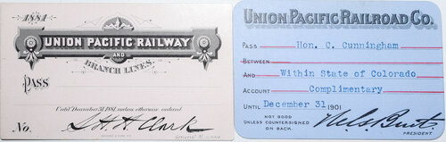 Lot: 491 Description: UNION PACIFIC PASSES – includes a 1881 unissued pass and a 1901 gray on blue pass issued to Hon. C. Cunningham. Good condition. Minimum bid: $20 Price Realized: $20 |