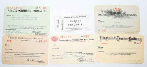 Lot: 498 Description: PASS LOT 5 – includes: 1918 Nevada Central unissued; 1953-54-55 Nevada Northern issued to V.G. Wright Freight Traffic Manager Colorado & Southern; 1930 Tonopah & Goldfield unissued; 1933-34 Tonopah & Tidewater unissued; 1922 Virginia & Truckee unissued along with V&T ticket stub from Carson to Virginia. Minimum bid: $50 Price Realized: $75 |
