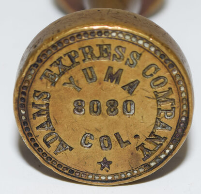 Lot: 503 Description: ADAMS EXPRESS COMPANY SEAL – YUMA, COLO 8080 on round brass matrix with brass toadstool handle. Small edge dings and top of handle shows repair. Minimum bid: $50 Price Realized: $110 |