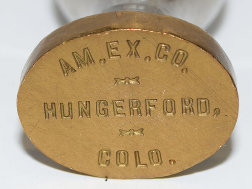 Lot: 504 Description: AM EX CO SEAL – HUNGERFORD, COLO on oval brass matrix with nickel bulbous handle. Nice condition and no hallmark present. Minimum bid: $40 Price Realized: $170 |