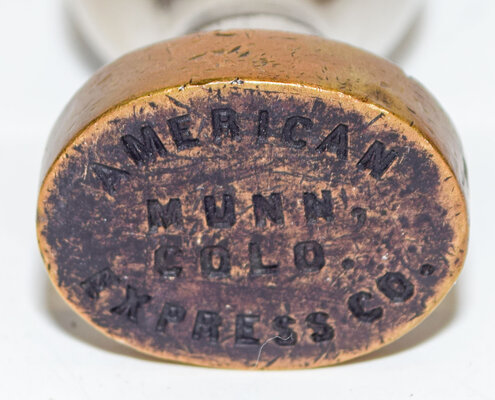 Lot: 508 Description: AMERICAN EXPRESS CO SEAL – MUNN, COLO on oval brass matrix with nickel bulbous handle. Nickel is worn and matrix is dark. Minimum bid: $40 Price Realized: $65 |