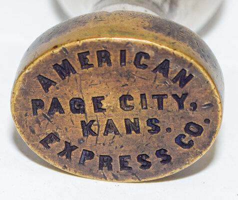 Lot: 509 Description: AMERICAN EXPRESS CO SEAL – PARK CITY, KANS on oval brass matrix with nickel bulbous handle. Some normal wear and good display. Minimum bid: $40 Price Realized: $75 |