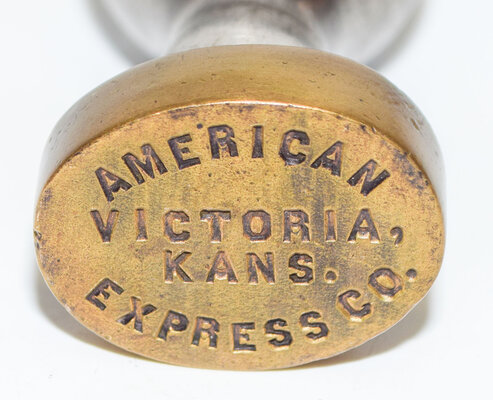 Lot: 511 Description: AMERICAN EXPRESS CO SEAL – VICTORIA KANS on oval brass matrix with nickel bulbous handle. Moderate wear to the nickel plate but seal is good. Minimum bid: $40 Price Realized: $70 |