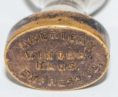 Lot: 512 Description: AMERICAN EXPRESS CO SEAL – WINONA, KANS on oval brass matrix with nickel bulbous handle. Wear to the nickel otherwise nice. Minimum bid: $40 Price Realized: $65 |
