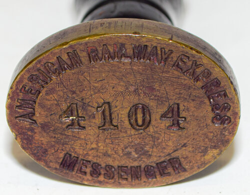 Lot: 514 Description: AMERICAN RAILWAY EXPRESS SEAL – MESSENGER 4014 on oval brass matrix with tall spun wooden handle. Good used condition. Minimum bid: $40 Price Realized: $40 |