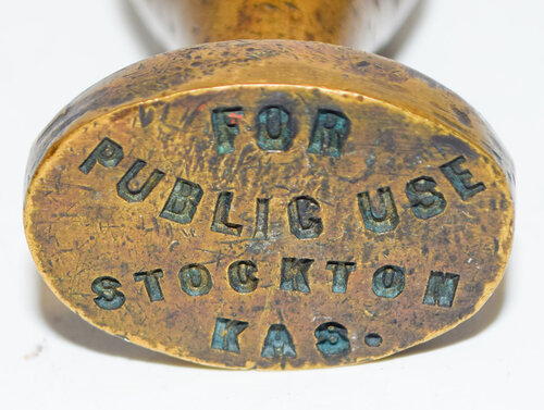 Lot: 517 Description: FOR PUBLIC USE SEAL – STOCKTON, KANS on oval brass matrix with brass bulbous handle. Good used condition. Minimum bid: $20 Price Realized: $20 |