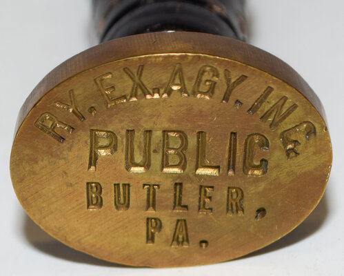 Lot: 520 Description: RY.EX.AGY. INC PUBLIC SEAL – BUTLER, PA on oval brass matrix with tall wooden spun handle. Nice condition and ready to display. Minimum bid: $20 Price Realized: $480 |